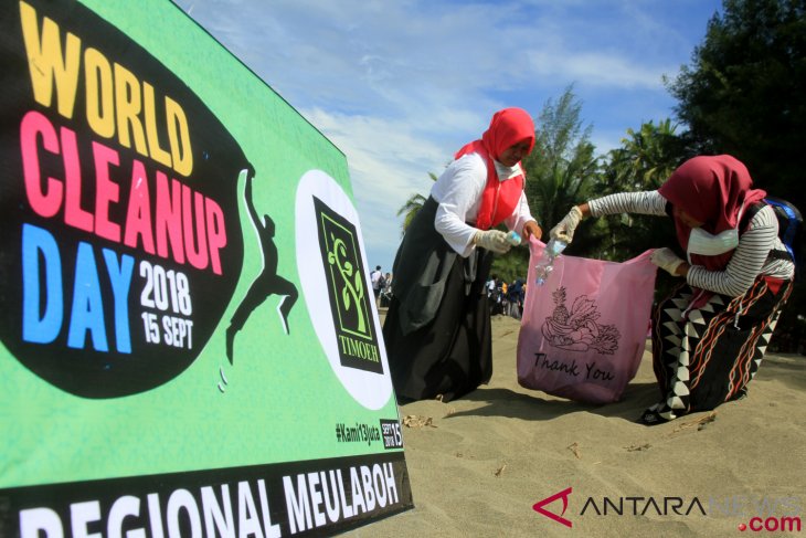 Aktivis pencinta lingkungan membersihkan sampah saat peringatan World Cleanup Day di Kawasan Desa Suak Timah, Johan Pahlawan, Aceh Barat, Aceh, Sabtu (15/9/2018). Aksi World Cleanup Day yang melibatkan 13 juta penduduk di seluruh Indonesia bertujuan untuk memerangi masalah sampah di darat dan laut serta untuk menanamkan kesadaran kepada masyarakat tentang pentingnya menjaga lingkungan. ANTARA FOTO/Syifa Yulinnas/foc.