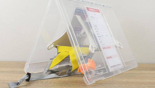 同商品はファイルケースの形をした簡易ヘルメットです。厚さ約18mmのA4サイズなので、気軽に持ち運びできるのが大きな特徴。ケースがヘルメットとして機能する他にも、“LEDライト”“ホイッスル”“多目的ポリエチレンシート”などの防災グッズがセットになっています。日常生活では携帯が難しい“ヘルメット”をコンパクト化させるとは… 防災グッズに革命をもたらすアイデア商品ですね。