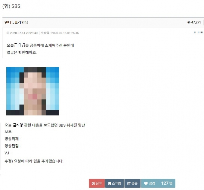 지난 14일 온라인 커뮤니티 클리앙의 한 이용자는 SBS 모 기자의 얼굴 사진과 기사 내용을 공개하고 "혐(혐오)"이라는 제목의 글을 게시했다. 이 이용자는 '클리앙을 공중파에 소개해 준 분인데 얼굴은 확인해야죠'라는 말을 덧붙였다.