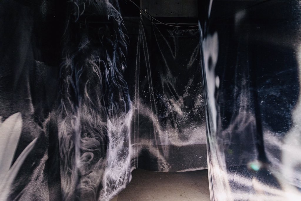 この作品は過去に2度展示していて、1度目はとても暗い空間に展示しました。目を凝らしてだんだん目が慣れてくると、布にプリントした日本とルーマニアの景色がじわーっと浮かび上がり重なり合います。洞窟の中を進むような感覚を意識したのですが、せっかくのプリントが見えにくいという意見をいただくこともありました。