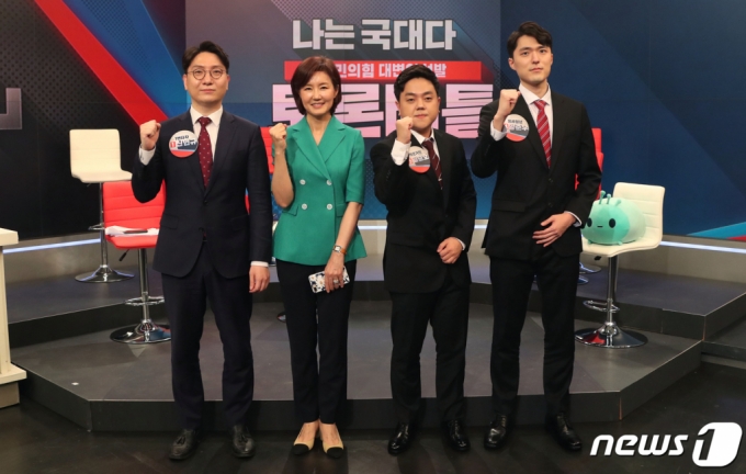 | 지난달 30일 국민의힘 대변인 선발을 위한 토론 배틀 '나는 국대다(국민의힘 대변인이다)' 에서 4강에 진출한 신인규(왼쪽부터), 김연주, 임승호, 양준우 후보가 기념촬영을 하고 있다. /사진제공=뉴스1 |