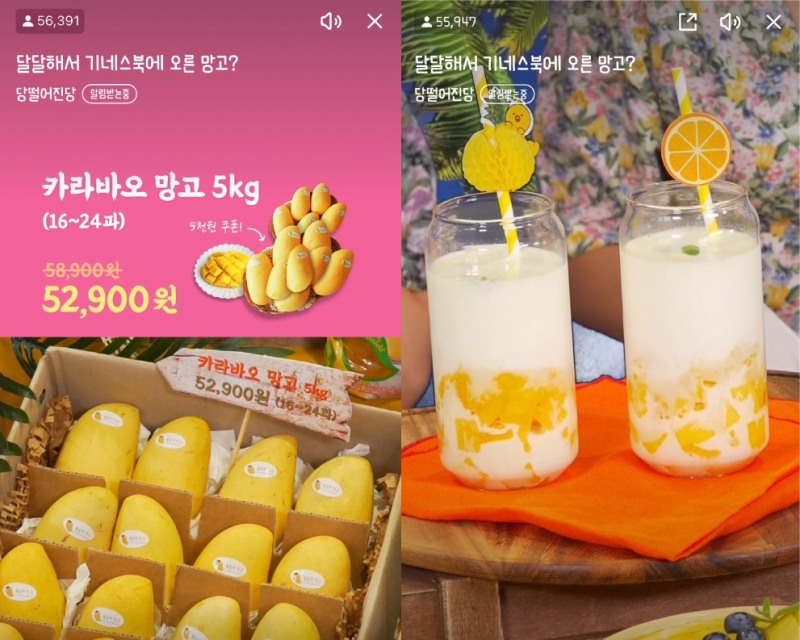 과일엔은 필리핀산 프리미엄 카라바오 망고를 4~5입(1.1kg), 9~12입(2.5kg), 16~24입(5kg) 세가지 상품으로 구성된 배민 쇼핑라이브 전용 상품을 선보였다. 또한 구매 인증 시 집에서도 쉽게 만들어 먹을 수 있도록 도와주는 ‘레디 투 스무디’ 1팩을 사은품으로 제공하여 소비자들의 관심을 이끌어냈다.