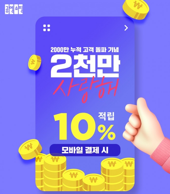 공영쇼핑은 10월 1일부터 11일까지 ‘2000만 사랑해’ 행사를 연다고 30일 밝혔다. 공영쇼핑 누적 가입 고객이 2000만 명을 돌파하자 고객에게 감사의 의미를 전하기 위해 이번 행사를 마련했다.