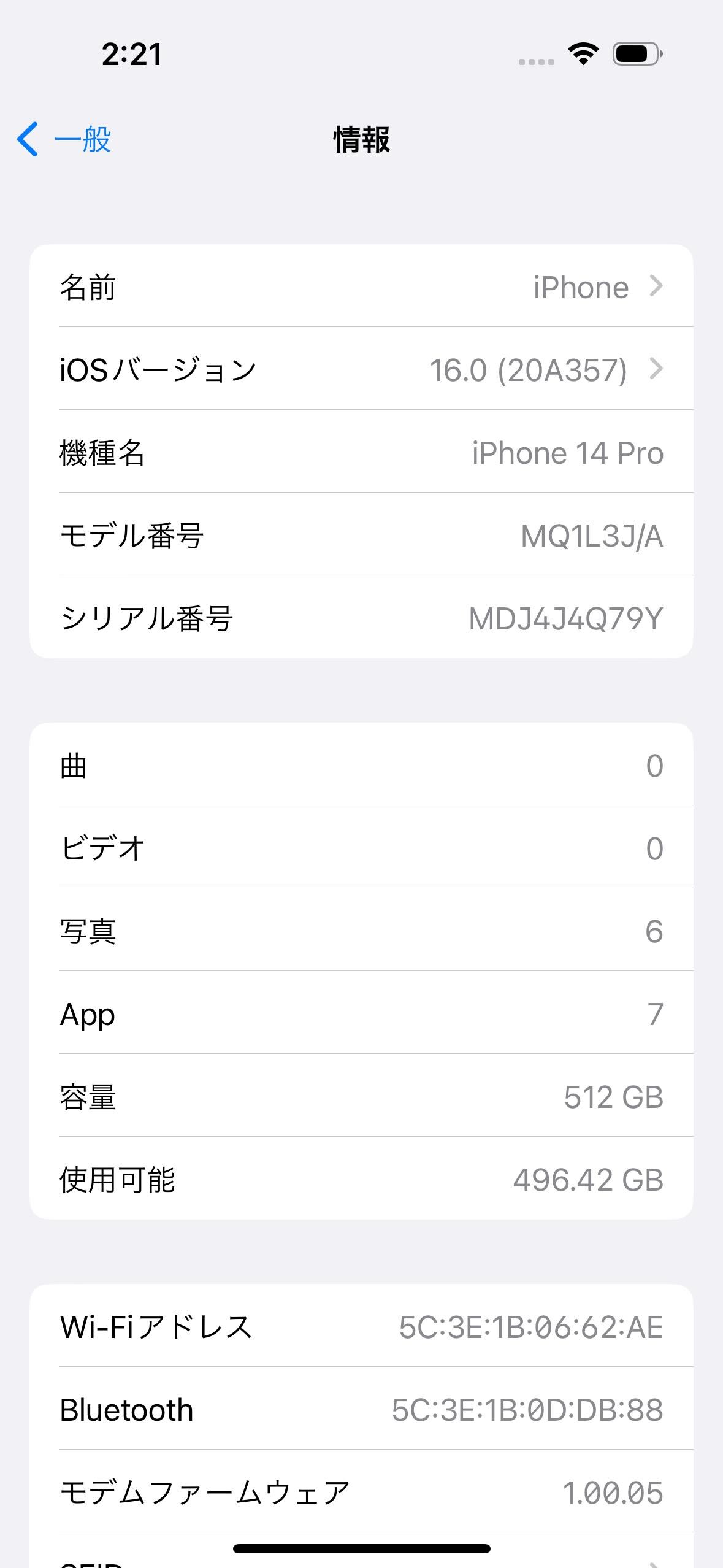 「設定」→「一般」→「情報」にて日本向けに販売されているiPhone 14 Proの型番が「A2889」、モデル名が「MQ283J/A」であることが確認可能。購入直後はiOS 16.0(20A357)がプリインストールされていますが、すでに紹介しているようにiOS 16.0.1(20A371)やiOS 16.0.2(20A380)が配信開始されています