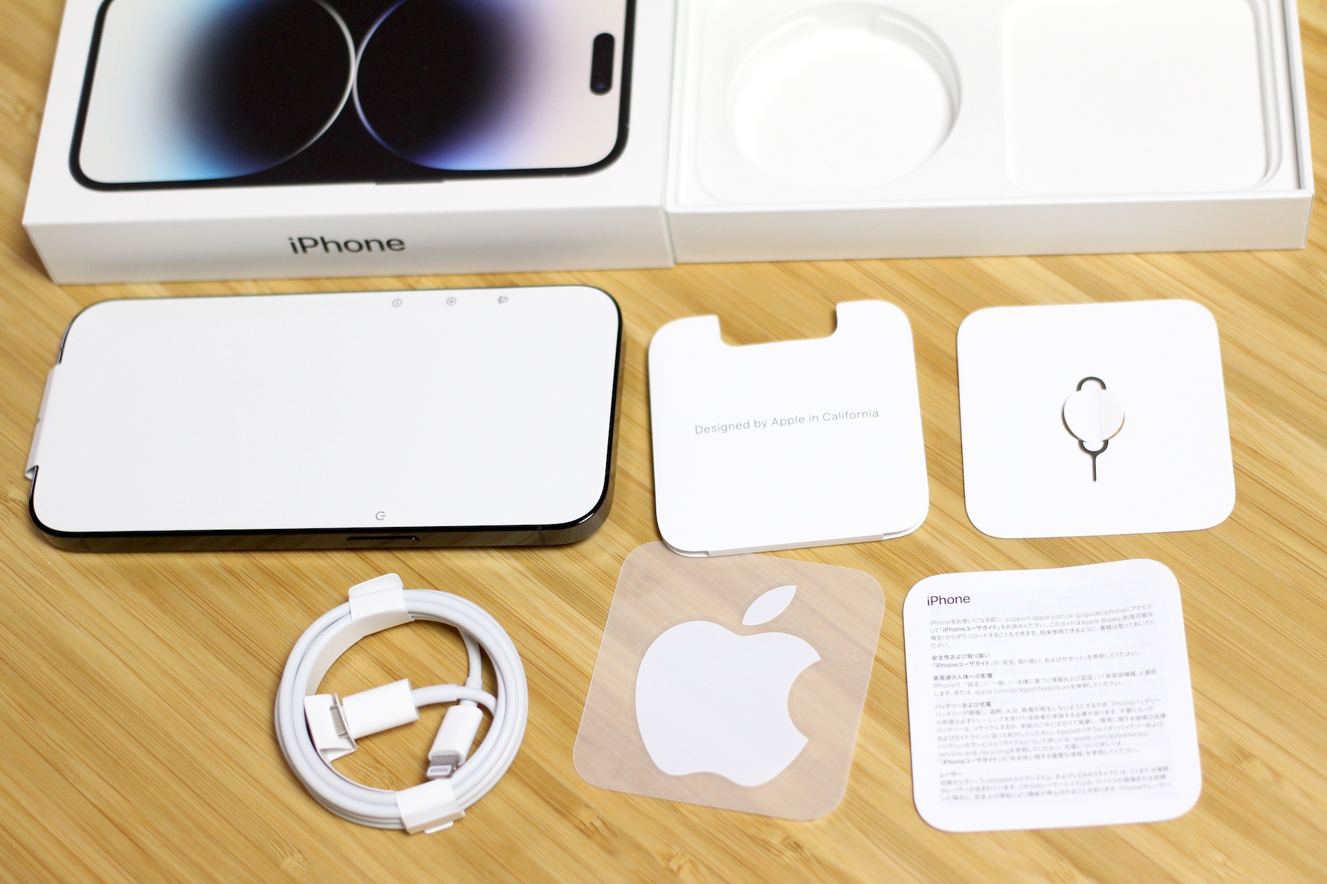 箱には型番やモデル名、IMEI、IMEI2(eSIM分)などが記載されており、日本で販売されるiPhone 14 Proは型番「A2889」、モデル名「MQ283J/A」です。箱を開けると、iPhone 14 Proの本体が背面を上にしてお目見えします。本体の下には付属品が同梱されており、同梱品はUSB-C to LightningケーブルとSIMピン、Appleのロゴである「りんご」のシール(1枚)、簡易取扱説明書などの紙類のみです。