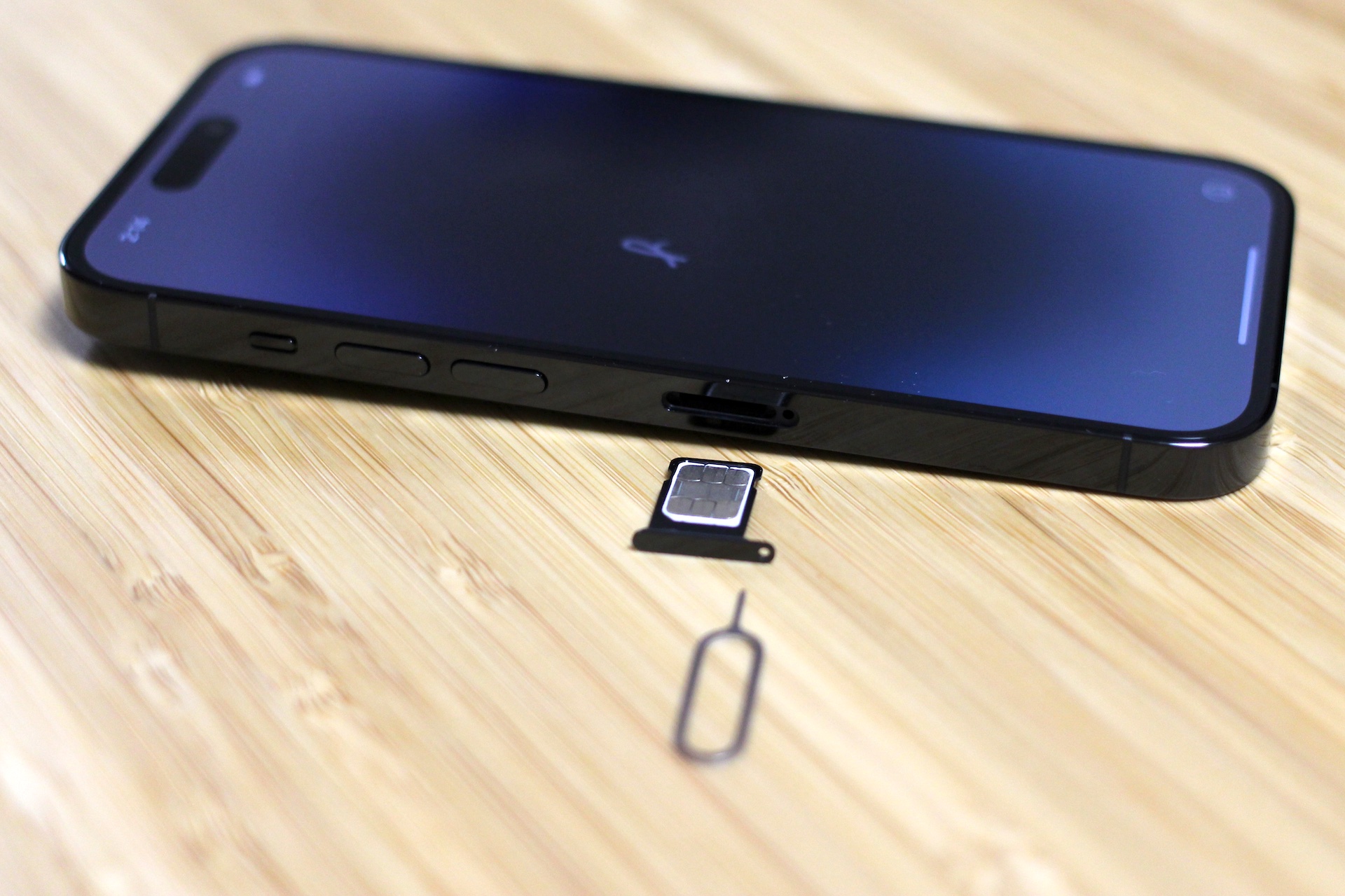iPhone 14 ProのSIMカードスロットを引き出したところ。取りつけるできるSIMカードの枚数は日本向けモデル「A2889」では1枚のみ。なお、デュアルeSIMにも対応しており、DSDVでの利用も可能