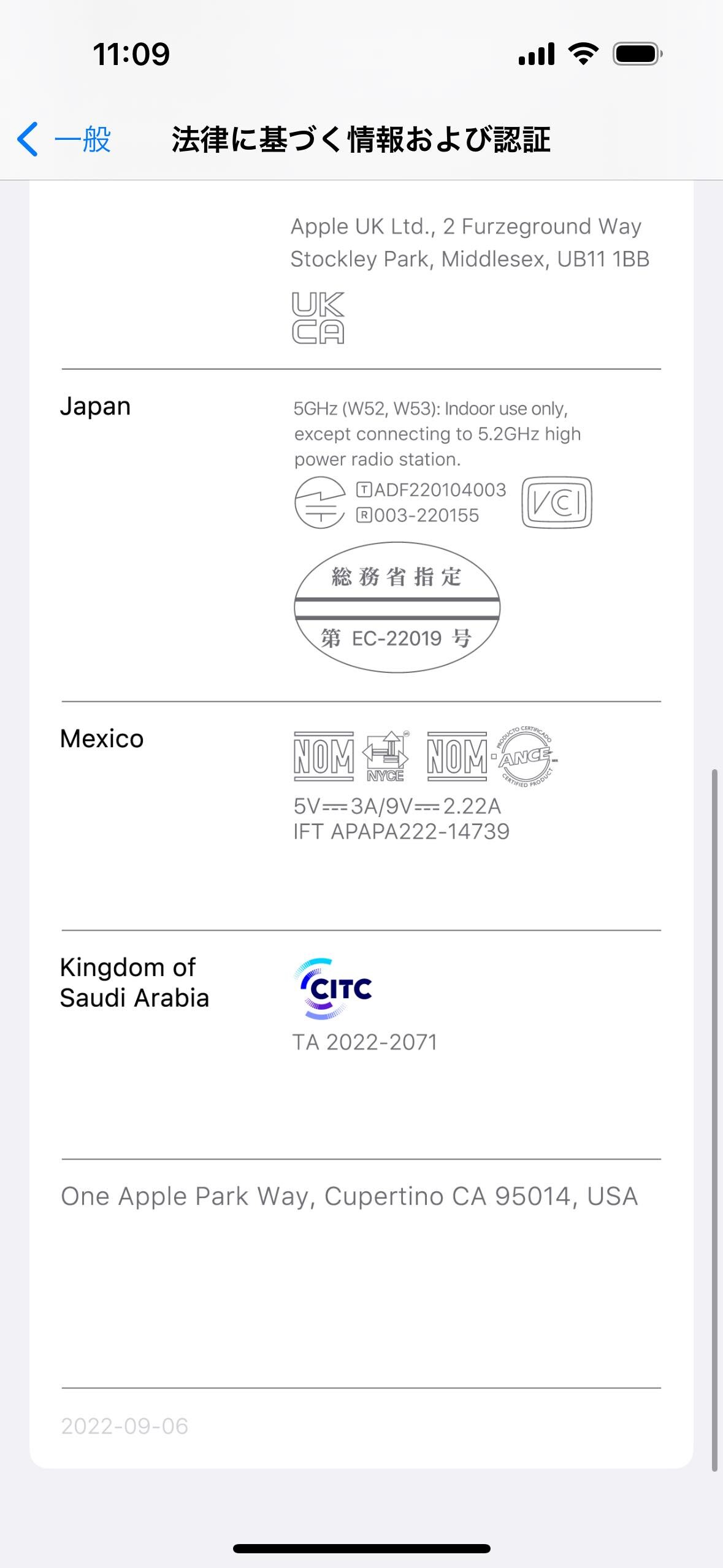 日本向けの認証(いわゆる「技適」)は電波法に基づく技術基準適合証明・工事設計認証(R)は「003-220155」、電気通信事業法に基づく技術基準適合認証(T)は「ADF220104003」。FeliCa・NFCのための「総務省指定」マークも電子式表示。残念ながら日本では緊急SOSのための衛星通信に関する認証は取得されておらず。またFCC IDは「BCG-E8150A」