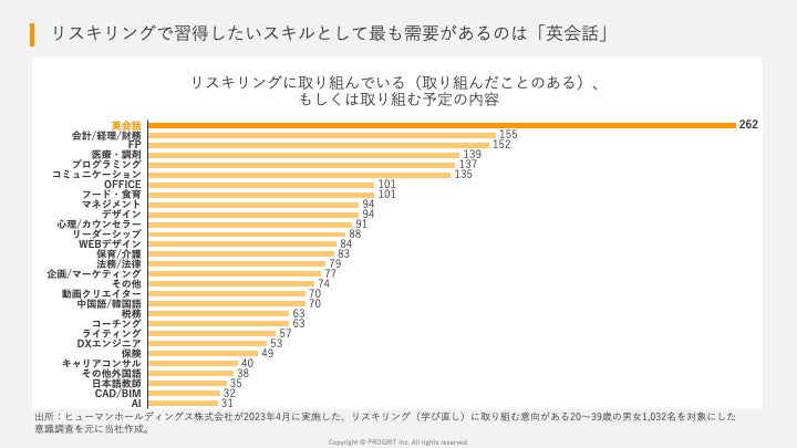 ヒューマンホールディングスが行ったリスキリングに関する意識調査によると、リスキリングに取り組んでいる(取り組んだことのある)、もしくはこれから取り組みたいと思っている分野に関する質問において、「英会話」の回答が最も多い結果となりました。(https://www.athuman.com/news/2023/16659/)