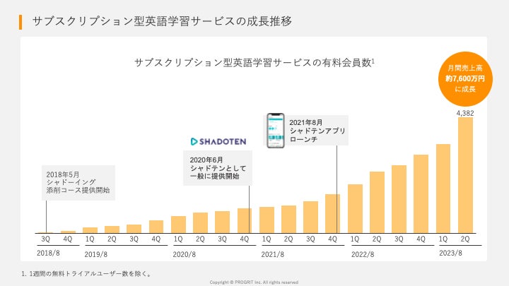 シャドテンは、英語コーチングサービス「プログリット」の卒業生のみを対象に提供していたシャドーイング添削サービスを2020年6月より一般向けに提供開始したもので、2023年2月時点で、月間売上高は約7,600万円に成長しています。