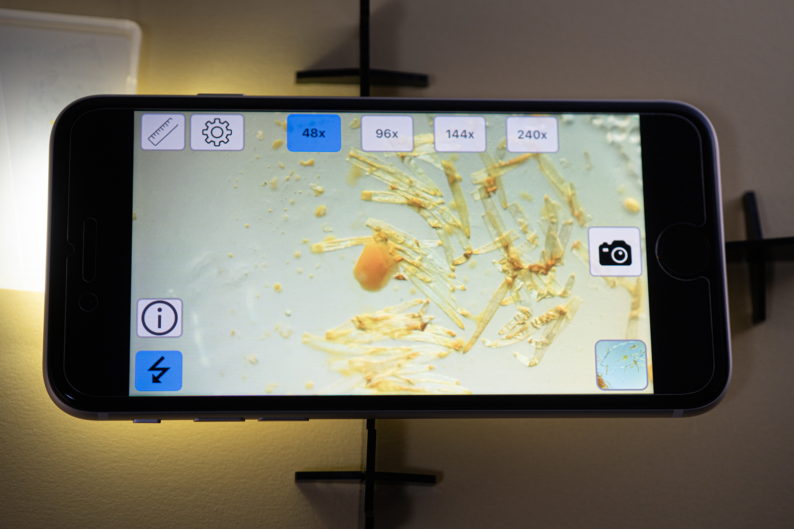 他の2つのレンズでは、観察対象をキットの専用ケースに乗せ、付属のフォーカススタンドをスマホを置く位置の左右と後ろに設置し、その上にスマホを置きます。傾斜のある後ろのスタンドを押したり引いたりしてスマホの角度を調整することで、ピントを合わせていきます。「ミクロハンター」は通常の顕微鏡のようにレンズや観察対象が固定されていない分、フォーカスを合わせるのが少々難しいです。観察対象とスマホが並行になるようにするとピントの合う範囲が広くなります。何度か試してコツを掴んでいきましょう。