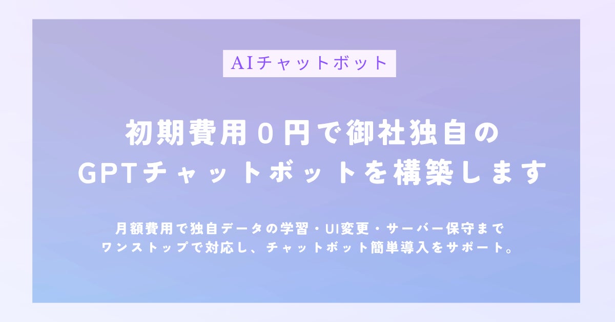 独自データセットを学習したChatGPTのAPI連携のチャットボットです。初期費用無料、月額費用のみで独自データの学習・UI変更・サーバー保守まで対応します。